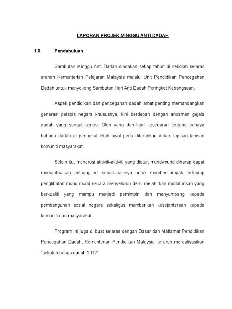 October 3 2010 kbssmkp Leave a comment. Program Minggu Anti Dadah peringkat sekolahObjektif program ini adalah untuk meningkatkan kefahaman dan kemahiran pendidikan pencegahan kepada muridguru dan kakitangan sekolah supaya dapat mengelakkan diri daripada terjebak dalam kancah najis dadah. Lihat contoh soalan dan kerangka karangan untuk bahagian pendahuluan yang akan kita bincangkan di bawah ini.